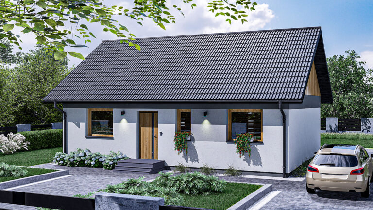 Dom wkomponuje się nawet na mniejszą działkę, dzięki bocznym elewacjom bez otworów okiennych możemy usytuować dom bliżej granic nieruchomości lub powiększyć dom o wiatę czy garaż.